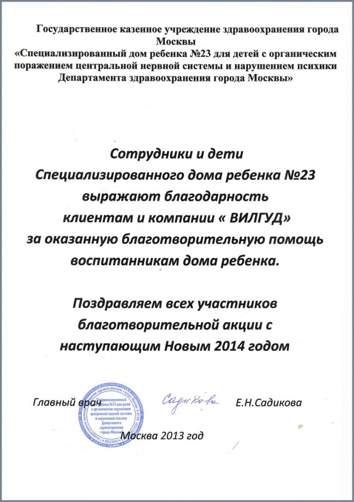 С 3.12.2013г. по 31.12.2013г. в “Вилгуд” проходила благотворительная акция в результате которой в “Дом ребенка № 23” была оказана помощь от лица всех клиентов сервиса, принявших участие в акции.